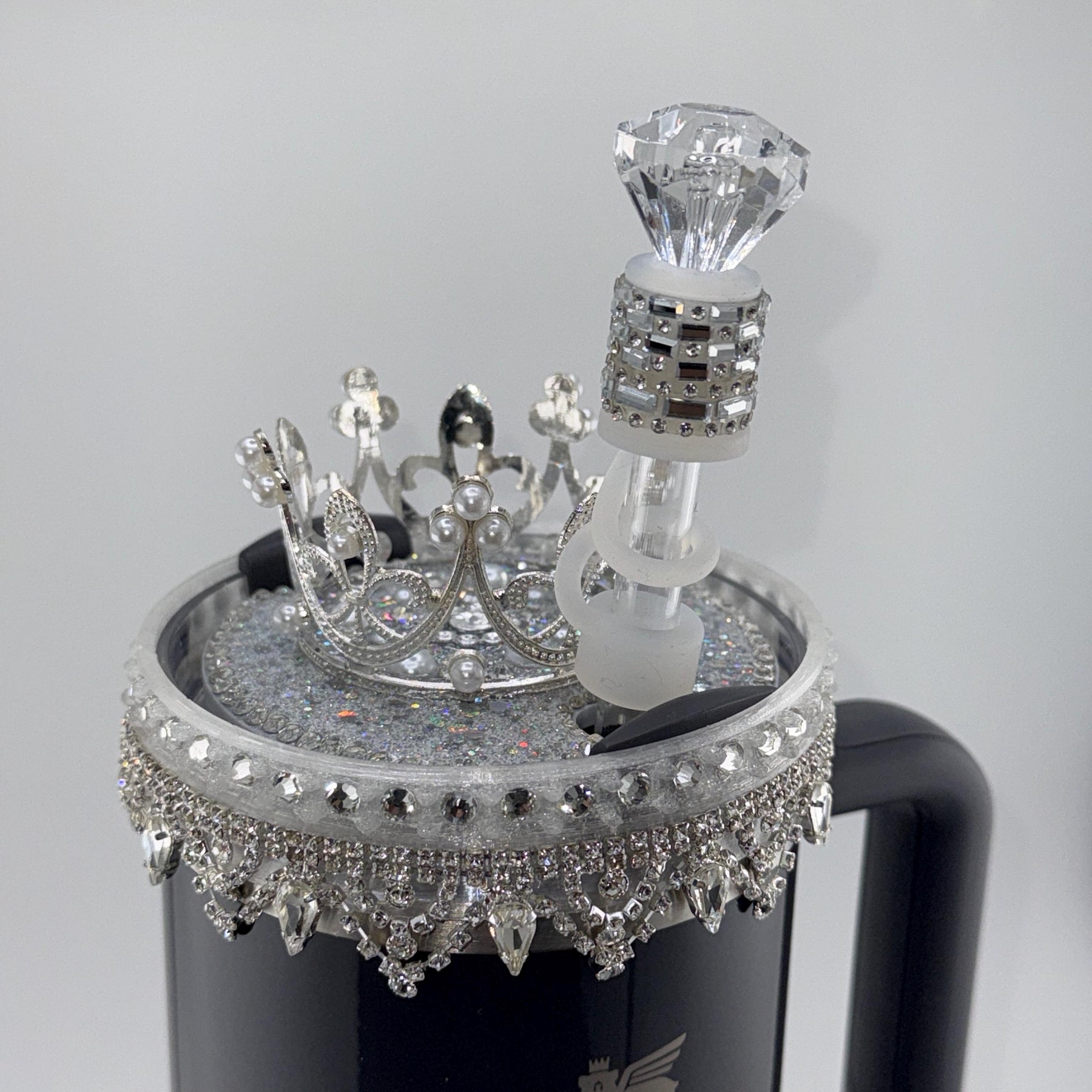 This listing is for the straw topper and not the crown topper or lid halo sitting on the lid. Photo to show a possible use with the straw topper.