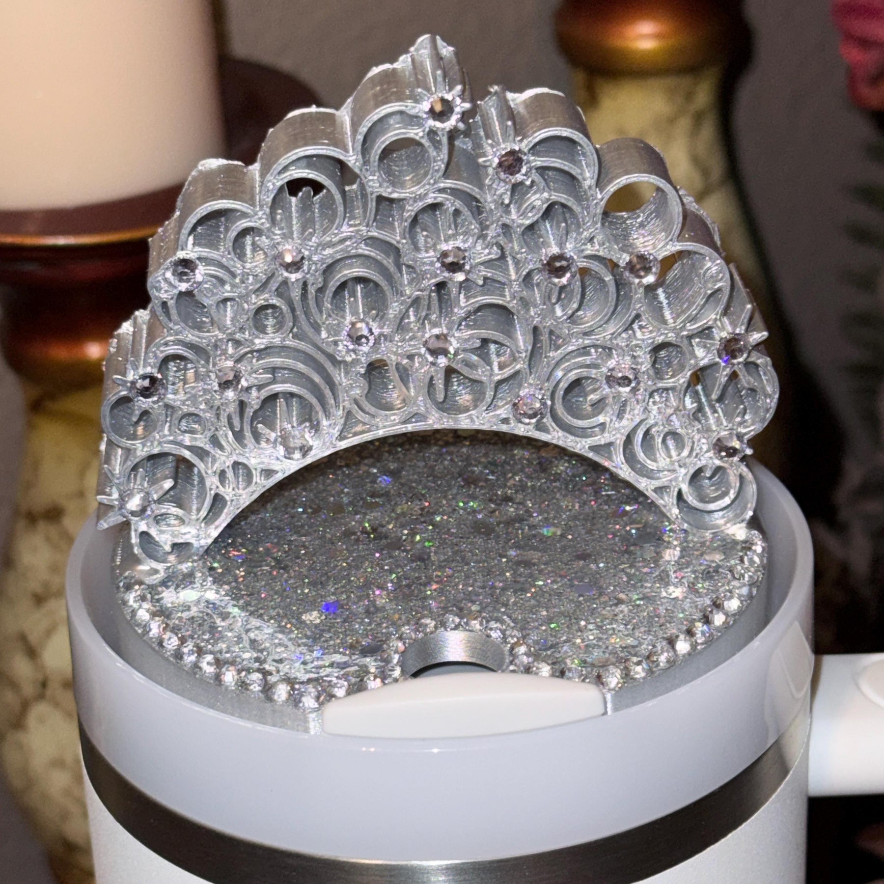The rhinestone crown topper has rhinestones throughout the crown. The topper will fit right on top of your own lid.